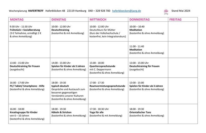 In unserem aktuellen Wochenplan finden Sie Angebote, die regelmäßig im Hafertreff im Stadtteil Haferblöcken stattfinden. Klicken Sie dafür hier.