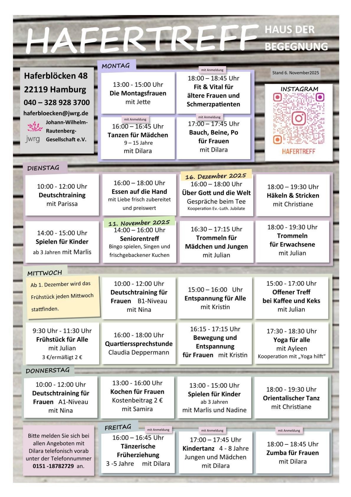 Das Haus der Begegnung HAFERTREFF ist ein Treffpunkt für Menschen aller Generationen und Nationalitäten im Wohngebiet Haferblöcken und Dringsheide.